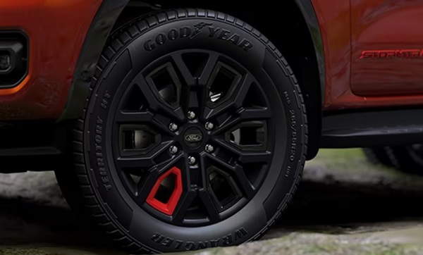 Bánh xe hợp kim 20 inch độc đáoFord Ranger Stormtrak được trang bị mâm hợp kim Asphalt Black 20 inch sơn mờ, một nan màu đỏ tươi và 5 nan màu đen bóng. |